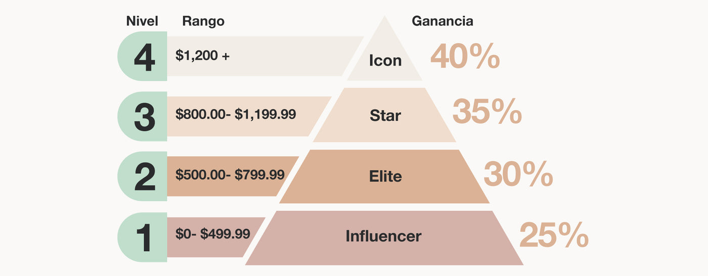 Ejemplo: si en el mes 1 acumulas $800 en ventas, en el mes 2 subirás al nivel "Star" y